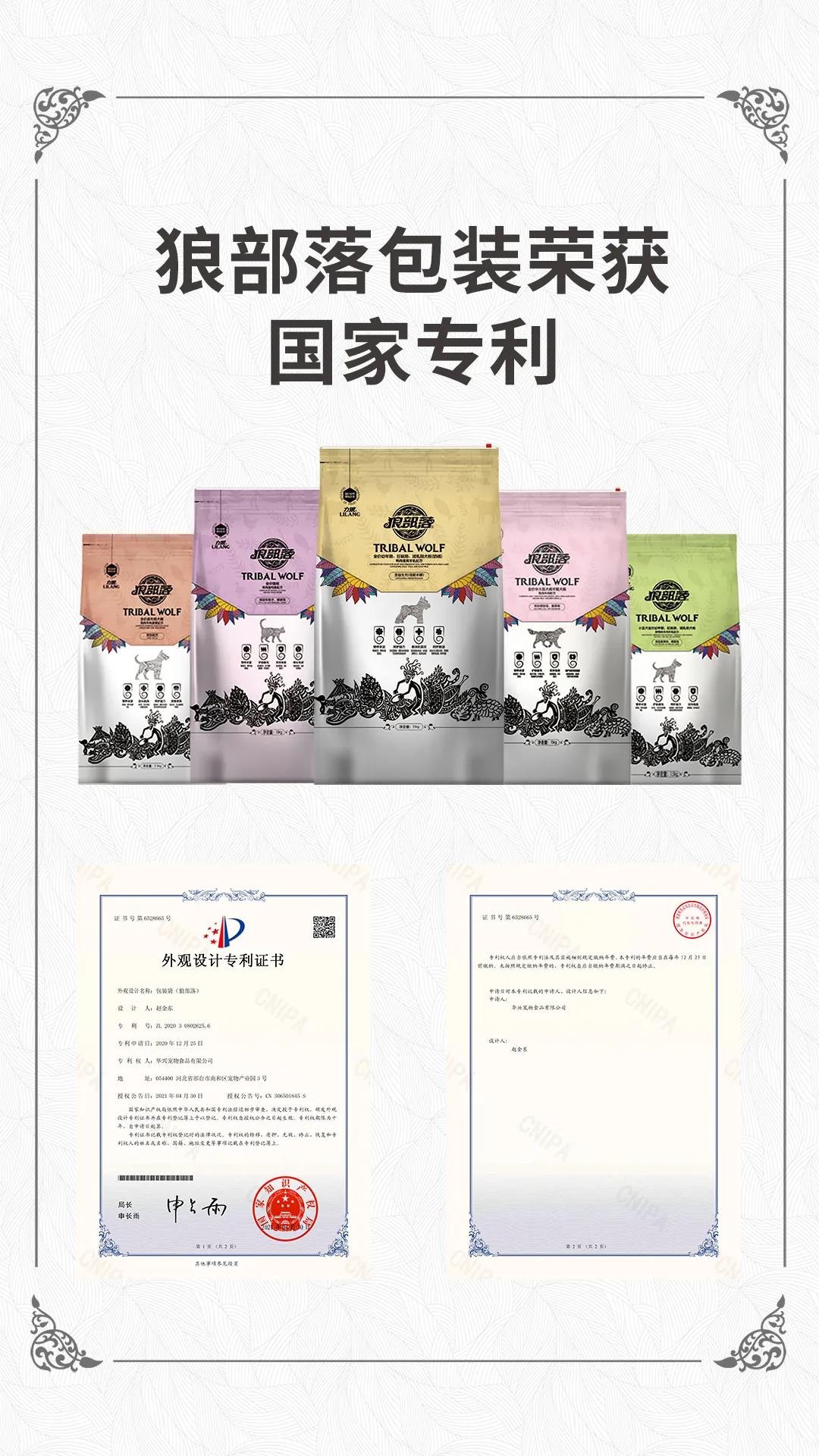 近日,国家知识产权局经过初步审查,力狼狼部落包装袋外观设计被授予专利权,颁发外观设计专利证书,专利号:ZL 2020 3 0802625.6,并在专利登记薄予以登记。