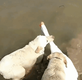 还有前段时间一只大白鹅要下水玩,两只熊狗子就死活拖着人家往岸上走,生怕把这大兄弟给掩喽~
